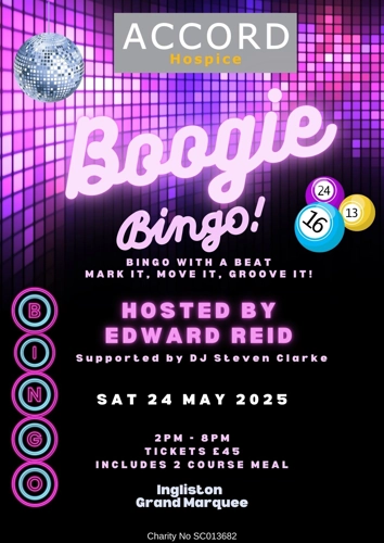 Get ready for an afternoon of fun, laughter, and non-stop entertainment at Boogie Bingo on Saturday, 24th May at the stunning Ingliston Hotel Grand Marquee!
