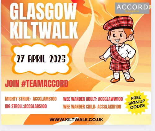The Glasgow Kiltwalk is calling, and it's your chance to step up and be a part of something truly incredible. Lace up those trainers, don your kilt or something tartan, and let's walk together for ACCORD Hospice!